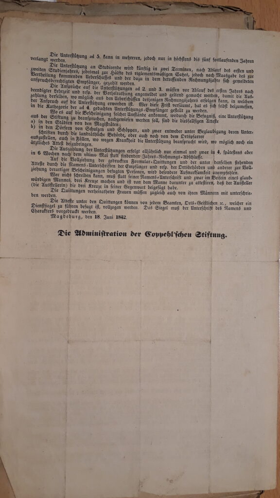 Den Magistrat bitte ich ganz ergebenst, mir hiernach gefälligst sobald als möglich die neue Auskunft ertheilen beger: das erbetene ist … übersenden zu wollen und dabei auch zu bemerken, wie viele Bogen die Stiftungsurkunde umfasst und welche Kosten das Kopieren derselben verursachen würde.