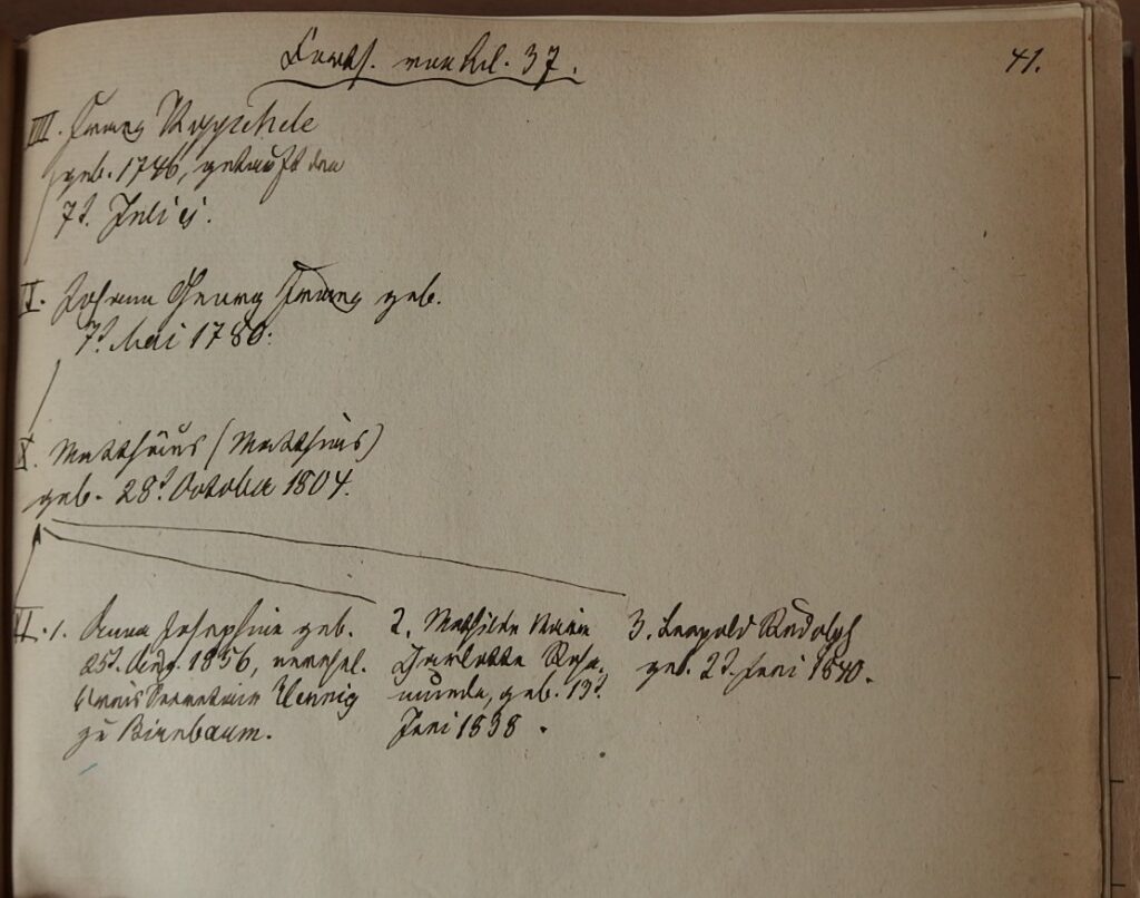 Wie ich schon oben sagte, waren Johann Dietrich und Johann Michael Brüder. Johann Dietrich und dessen Vater sowie die Vorfahren des letzteren, sind in dem dortigen Stammbaumsverzeichnisse enthalten. Die Anreihung folgt also von Johann K. ab. Von irgendeiner anderen Seite muss bereits versucht worden sein, die Anreihung des Michael oder Johann Michael und seiner Nachkommen bewirken zu lassen, da, wie ich mich durch Einsicht der Familienglieder-Verzeichnisse überzeugt habe der Hannes Michael als von Johann abstammend, mit Bleifeder in dem Verzeichnisse … vermerkt worden ist.