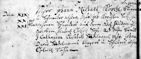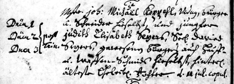 Mstr Johann Michael Kopehl, vir juvenil, Bürger und Schneider allhier, Mstr Johann Kopehlens Sohn, sel. [seelig] gewesenen Schneiders auf denen Adel. Häußern zu Grieben, hinterlass. eheleibl Sohn und deßen Braut J. Catharina Elisabeth Seidelmanns, Mstr. Johann David Seidelmanns, Bürgers und Schusters allhier, eheleibliche Tochter