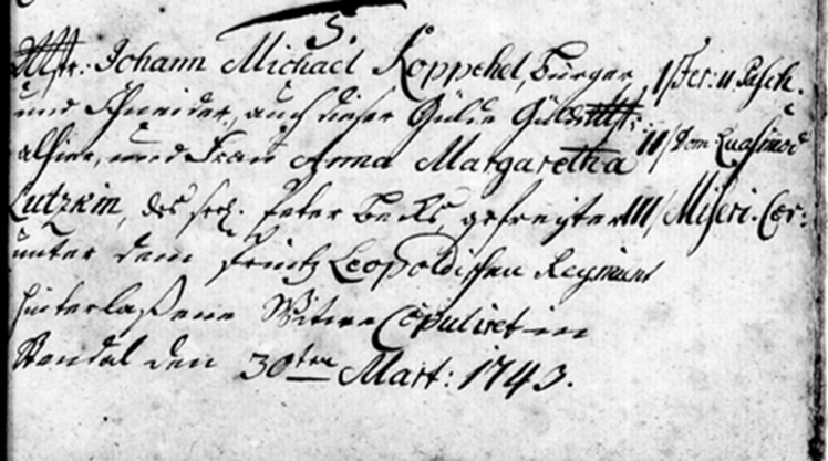 Einen amtlichen Eintrag zu Johann Michael Koppehele gibt es erst aus dem Jahr 1711, als er Catharina Elisabeth Seidelmann heiratete. Geschrieben Kopehl. Anhand dieser Dokumente zeigt sich wie wichtig es ist, eine weitere Angabe zu finden, in diesem Fall der Name der Ehefrau mit einem präzisen Heiratsdatum. 1726 wird der Name Koppehl geschrieben und 1743 Koppehel. Alle paar Jahre ein Buchstabe mehr, sozusagen. Auch das Schriftbild verbesserte sich in diesen Jahrzehnten deutlich.